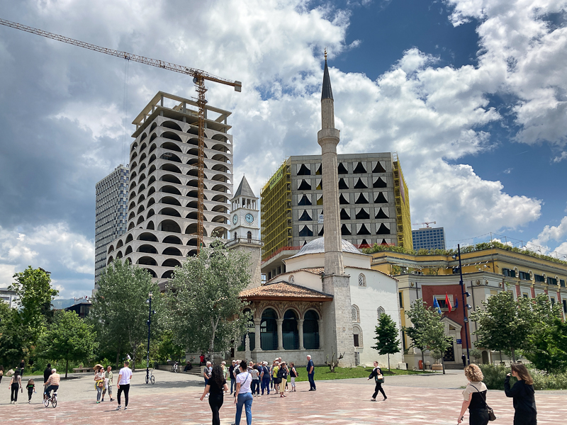 Auf dem Platz an der Ostseite steht die Et'hem-Bey-Moschee mit dem 35 Meter hohen Uhrturm. Das bunt bemalte islamistische Gotteshaus stammt aus dem 19.Jahrhundert. Die Ethem-Bey Moschee blieb auch im Sozialismus unberührt. Aber ab 1967 blieb die Moschee geschlossen bis zu ihrer Wiedereröffnung 1990.
