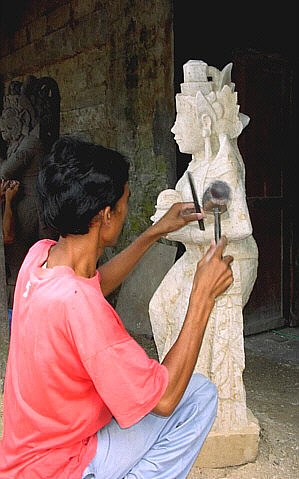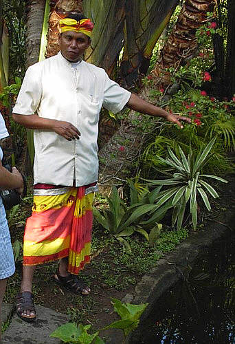 Balinesen (2) Einer unserer Reiseleiter in ländesüblicher Tracht in den Farben Gelb, Rot und Weiß. Das Deutsch der Reiseleiter von TUI ist gut zu verstehen. . Balinesen sind im Handwerk sehr geschickt. Hier besuchen wir eine Bildhauerwerkstatt. Die Handwerker hier besuchten eine Steinmetzschule. Außerdem sind die Balinesen bekannt für ihre Holzschnitzereien.