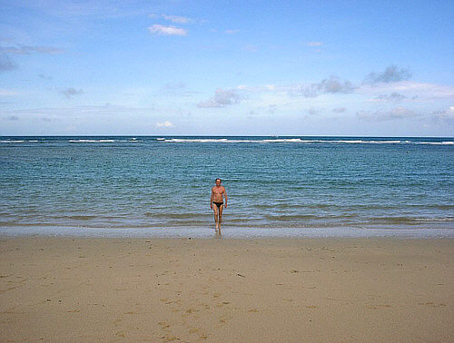 In Nusa Dua ist schöner Strand. Trotzdem sind nur wenige Menschen hier, obwohl hinter dem Strand schöne Hotels sind: