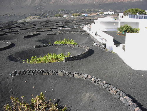 La Gería - Weinanbau auf Lanzarote - Anbau ohne Bewässerung, da sich in den Mulden Tau sammelt, die Steinmauern schützen vor Austrocknung durch Wind