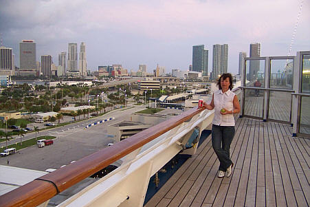 Nach dem Bezug unseres Staterooms 9182 auf dem Lido Deck (Deck 9) und nach einer Einweisung im Deck 3 unterhalb der Rettungsboote verließen wir 16.00 Uhr den Port of Miami, nachdem die Schiffssirene dreimal die Ausfahrt angekündigt hatte. Es war eine tolle Stimmung während der Ausfahrt, die durch Reggaemusik einer karibischen Live Band untermauert wurde. Nach dem Ablegen konnten wir noch lange auf Miami Beach blicken.