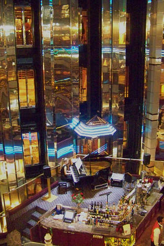 Das neunstöckige offene Atrium mit seinen Glasaufzügen sieht beeindruckend aus. Von ganz oben kann man bis runter zur Piano Bar sehen.