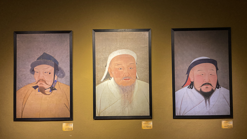 Statuen von Dschingis Khaan in der Mitte, daneben von einem seiner Söhne und eines Enkels.