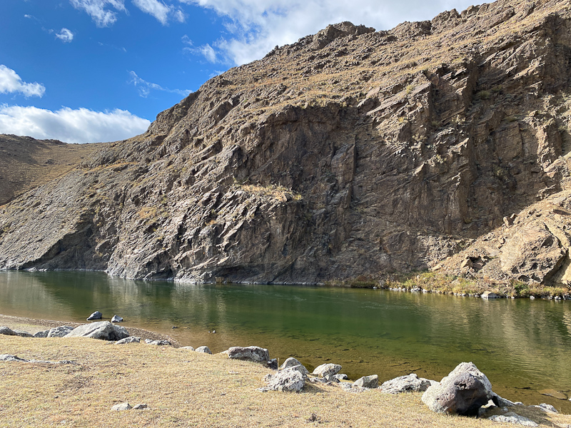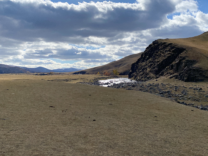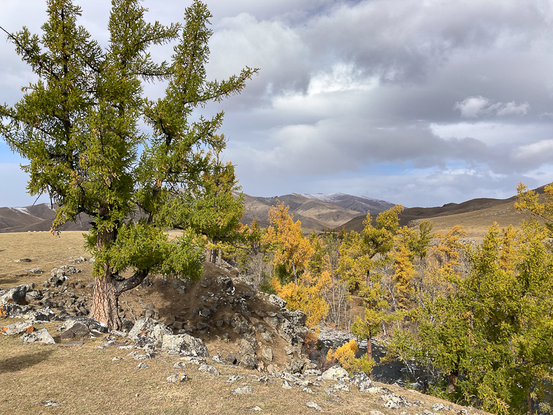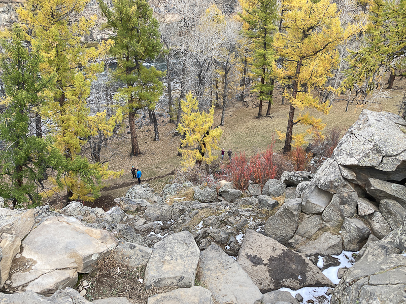 Wir wanderten am Orchon flussaufwärts weiter. Die flachen Hügel an der einen Uferseite nehmen an Höhe zu und gestalten sich zum Teil als hohe Felsen. Am Fluss wachsen bevorzugt Lärchenbäume, deren Nadeln infolge des Herbstes entweder gelb gefärbt oder bereits abgefallen waren.