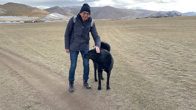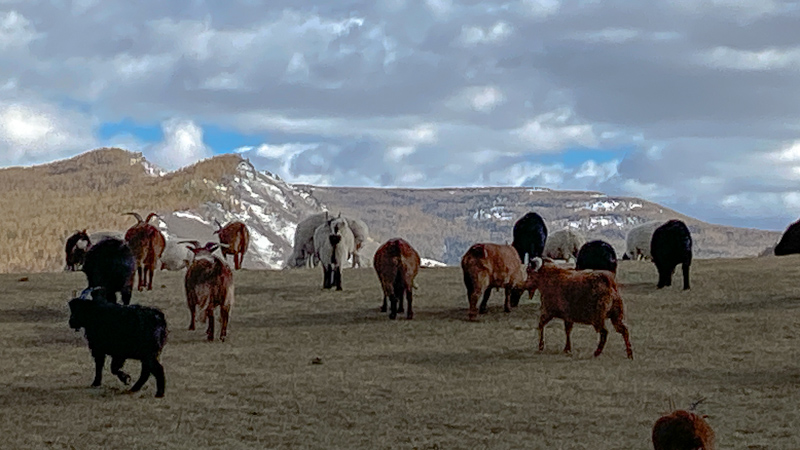 Auf dem Rückweg begegneten wir einer großen Ziegenherde, die auf dem Weg zum Ufer des Orchon war. Um die Tiere beim Trinken nicht zu verunsichern, verließen wir den Uferbereich und gingen auf der Hochebene zurück zum Camp.
