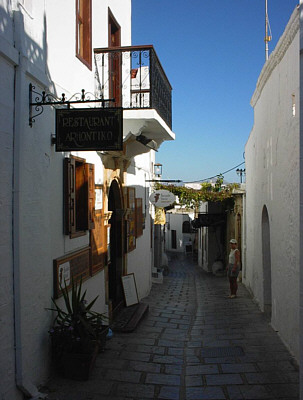 Typisch für den Kern von Lindos sind die Kapitänshäuser aus dem 17. Jh.. Fast jeder Hof weist Mosaike aus schwarz-weißen Kieseln (Kochlàki-Mosaik) auf.