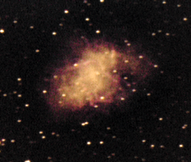 Der Krebsnebl M 1 wurde 1731 im Sternbild des Stiers entdeckt. Er ist aus der am 04.07.1054 beobachteten Supernovae entstanden. Im Zentrum befindet sich ein Pulsar - ein sehr schnell drehender Neutronenstern. Dieser Pulsar ist sehr lichtschwach und hier nicht sichtbar.