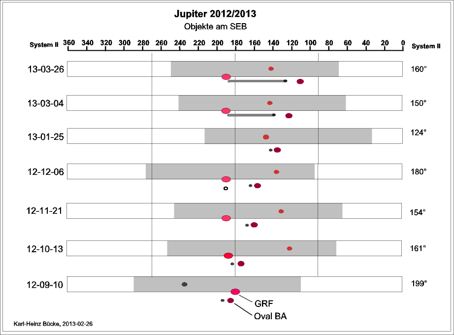 Südlich des GRF befindet sich das Oval BA. Es zog in der zweiten Septemberhälfte 2012 am GRF vorbei. Links vom Oval BA ist ein kleiner dunkler Fleck, der sich Anfang 2013 in einen dunklen fleckigen Streifen verändert hat.