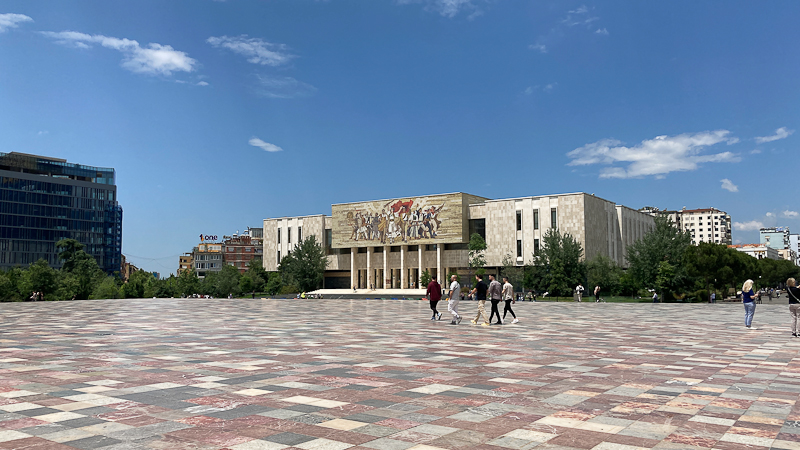 Der nach der Rückfahrt sich anschließende Stadtrundgang begann am bekannten Skanderbeg-Platz mitten im Zentrum. Der große zentrale Hauptplatz wurde 1930 angelegt und nach dem albanischen Nationalhelden Skanderbeg benannt.