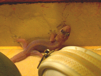 Hier ist ein Gecko in unserem Badezimmer. Er ist äußerst verängstigt und hat sich der Farbe der Umgebung angepaßt.