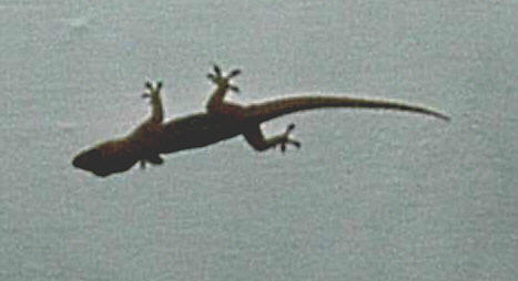 Geckos sind kleine Eidechsen, die wir überall, auch im Hotel, vorwiegend abends gesehen haben. Sie sind scheu, gewöhnen sich aber an die Nähe von Menschen, so daß sie sich sogar füttern lassen. In unserem Hotelzimmer war regelmäßig ein Gecko nachts an der Wand neben dem Bett - nicht unangenehm. Geckos kommen nicht näher oder gar über das Bett gelaufen. Sie jagen Insekten und Schädlinge - machen sich also nützlich. Geckos können schreiende Töne geben. Hier ein Gecko an der Decke unserer Terrasse. Er hat Saugfüße und kann sich an den Wänden gut festhalten: