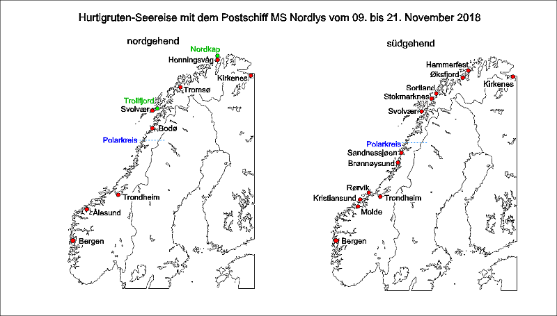 Unser Reiseverlauf dauerte 12 Tage, in denen wir die Strecke Bergen - Kirkenes - Bergen zurücklegten. Die ersten sieben Tage verlief unsere Tour nordgehend bis nach Kirkensen. Dort war der Wendepunkt der Reise, die Rücktour verlief südgehend. Dabei hatten wir zum Teil in den Orten längere Aufenthalte, die wir auf der Hinfahrt entweder nachts oder nur ganz kurz angefahren sind.