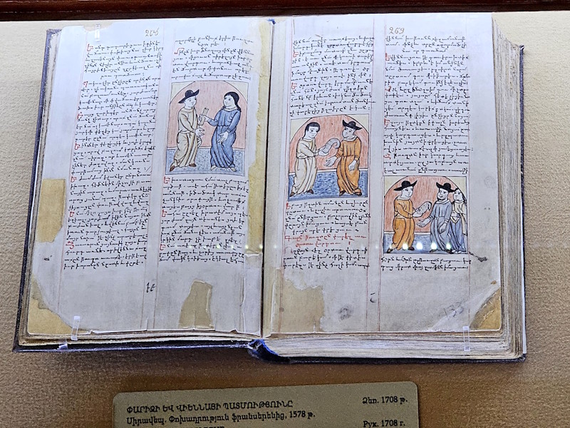 Matenadaran bedeutet Bibliothek und ist das Zentralarchiv für alte armenische Handschriften. Der größte Bestand stammt von der armenisch-apostolischen Kirche in Etschmiadsin. Seit 1939 befindet er sich in Jerewan und seit dem Ende der 1950ger Jahre in dem von Mark Grigoryan errichteten Gebäude im typisch neo-armenischen Baustil. Das Museum beeindruckte uns sehr, und durch die kompetente Führung einer Fachkraft wurde uns sehr viel über die verwendeten Materialien und die verschiedenen Farben aus unterschiedlichen Zeitepochen sowie die Entwicklung der Schriften nähergebracht.