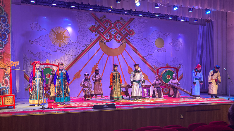 Abends fuhren wir zum National Academic Drama Theatre, in dem wir eine reichliche Stunde lang mongolische Kultur erlebten. Sehr interessant waren die typischen Kehlkopfgesänge, das Spielen auf der zweisaitigen Pferdekopfgeige, Tänze und die Darbietung von zwei Schlangenmädchen.