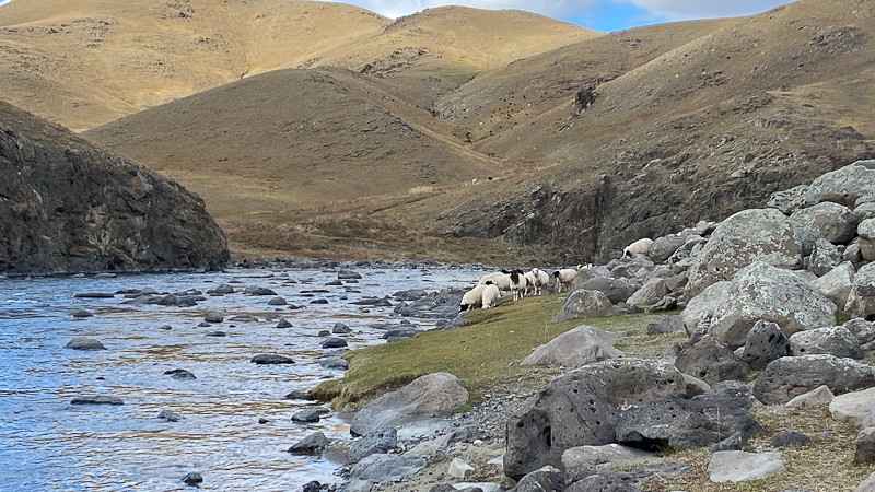 Auf dem Rückweg begegneten wir einer großen Ziegenherde, die auf dem Weg zum Ufer des Orchon war. Um die Tiere beim Trinken nicht zu verunsichern, verließen wir den Uferbereich und gingen auf der Hochebene zurück zum Camp.