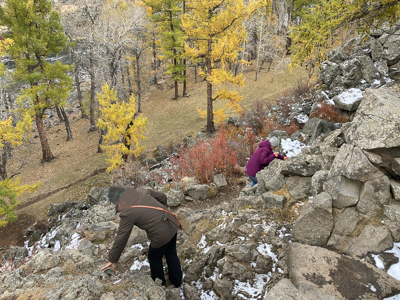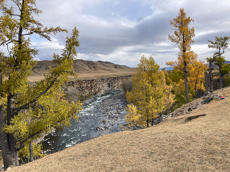 Wir wanderten am Orchon flussaufwärts weiter. Die flachen Hügel an der einen Uferseite nehmen an Höhe zu und gestalten sich zum Teil als hohe Felsen. Am Fluss wachsen bevorzugt Lärchenbäume, deren Nadeln infolge des Herbstes entweder gelb gefärbt oder bereits abgefallen waren.