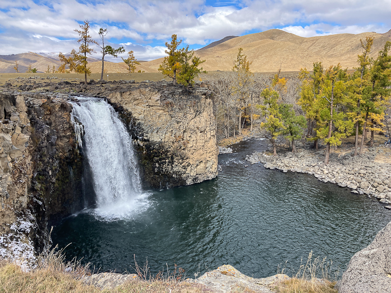 Der Orchon-Wasserfall, auch bekannt als Ulaan Tsutgalan, ist eine der schönsten Sehenswürdigkeiten der zentralen Mongolei. Mit 26 Metern ist er der größte Wasserfall im Land.