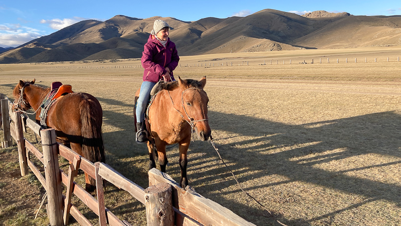 Da es mit dem geplanten Reiten nicht geklappt hatte, durfte ich zumindest einmal auf einem mongolischen Pferd „Probesitzen“. Da diese Pferde nicht so hoch sind, fühlte ich mich sofort wohl.