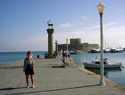 Am Mandráki-Hafen: An der Hafeneinfahrt stehen Hirsch und Hirschkuh, die Wappentiere der Insel. An dieser Stelle soll früher der Koloss von Rhodos gestanden haben. Die Hirsche vertrieben vor vielen Jahren die Schlangen von der Insel, übrig geblieben sind nur Blindschleichen.