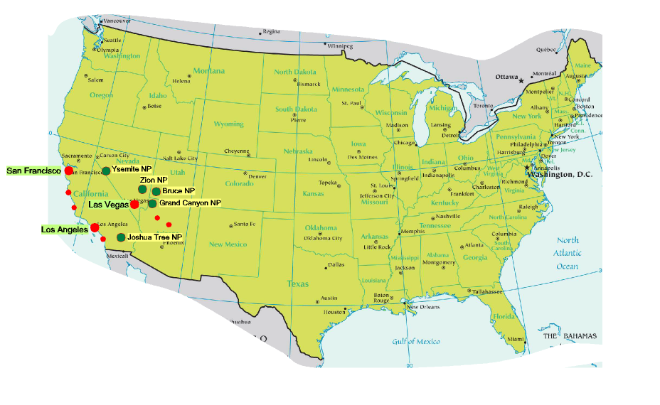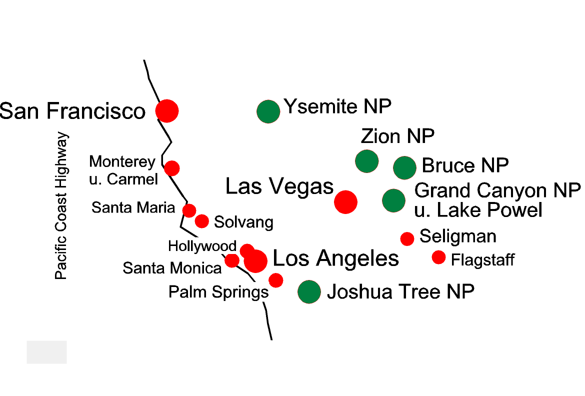Während unserer Rundreise durch den Westen der USA besuchten wir die Bundesstaaten Kalifornien, Nevada, Utah und Arizona mit den drei weltbekannten Großstädten Los Angeles, San Francisco und Las Vegas, grandioser Natur in verschiedenen Nationalparks sowie sehenswerten Ortschaften an der Pazifikküste.