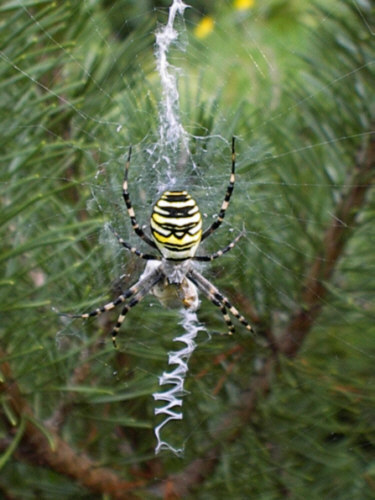 Diese schön gelbgestreifte, auffallende Radnetzspinne ist auf besonnten Waldlichtungen oder an Waldrändern anzutreffen, wo sie zwischen hohen trockenen Grashalmen oder in niedrigen Büschen ihre großen Netze spinnt. Hier lauert sie von Juli bis September auf Beute, die sich in ihrem Netz verfängt.