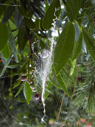 Von der Rückseite ist das Kokon zu sehen, die Spinne ist fast vollständig verdeckt:
